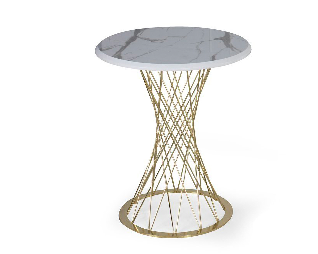 | Feature | The upper surface is white marble and the foot is gold colored metal. |